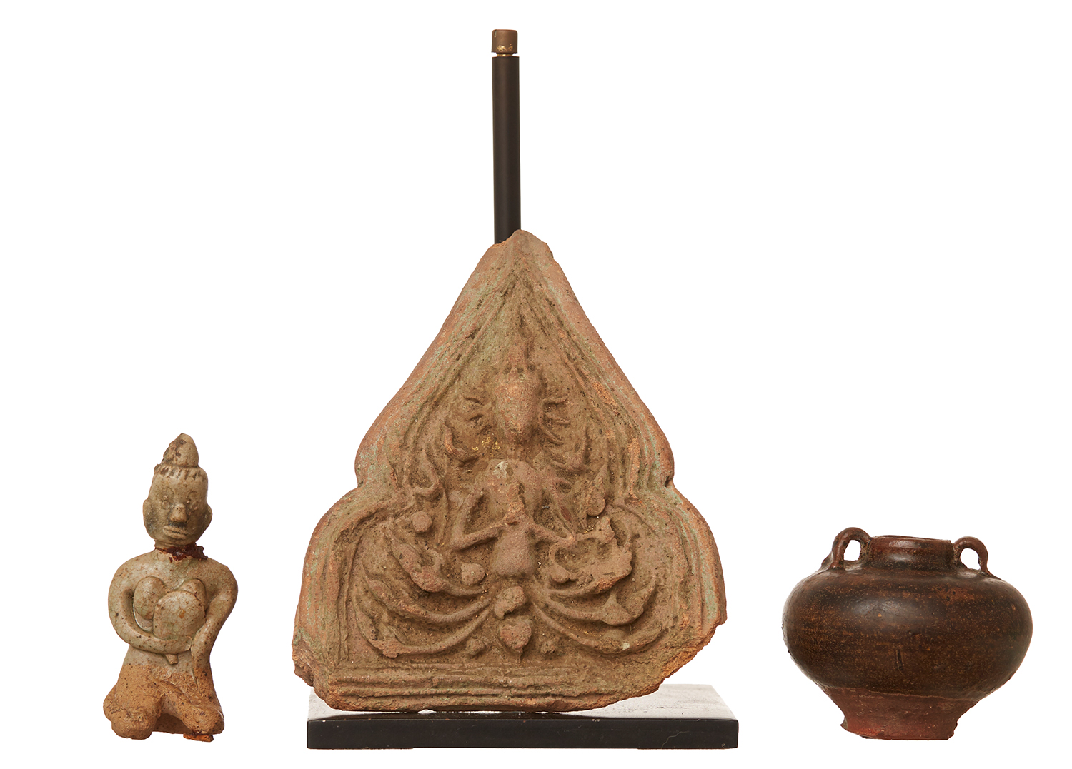AN OLD THAI CERAMIC TILE DEPICTING AN ANGEL, TOGETHER WITH A SMALL THAI BROWN WARE VESSEL & AN OLD SUKOTHAI KNEELING FIGURE
