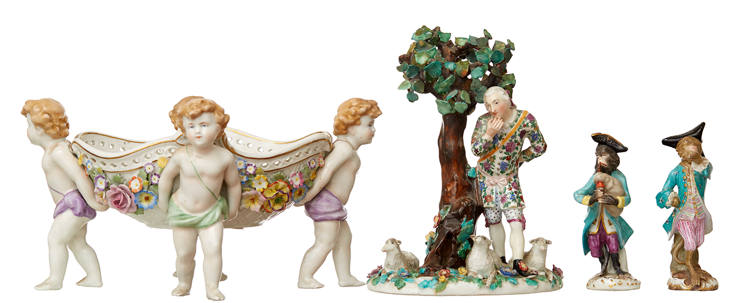 One monkey with chip to hat and cuff, the other with chip to foot. Comport in good order. Shepherd with loss and restoration to bocage.