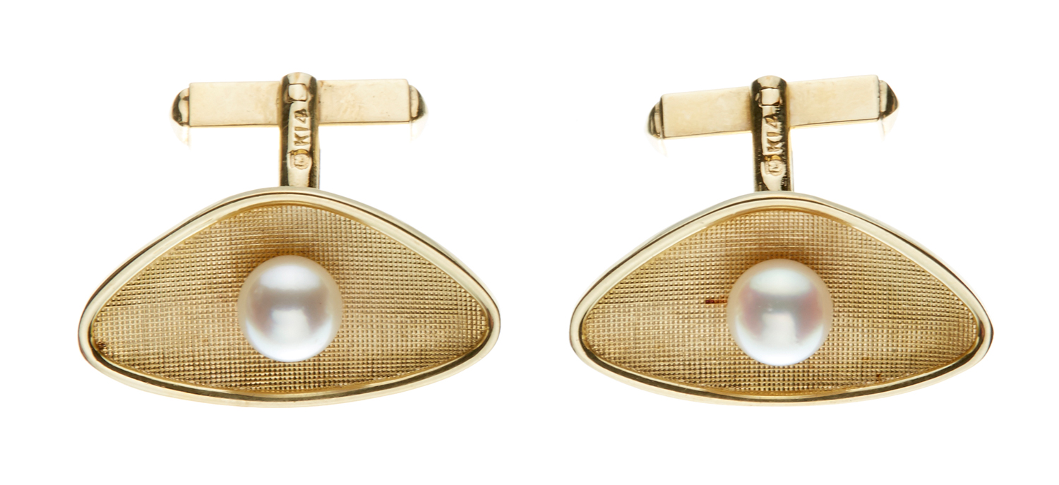 Each set with a cultured pearl, mounted in 14ct gold to propeller back fittings, with original box, together with a pair of 14ct gold cufflinks of abstract design (2)