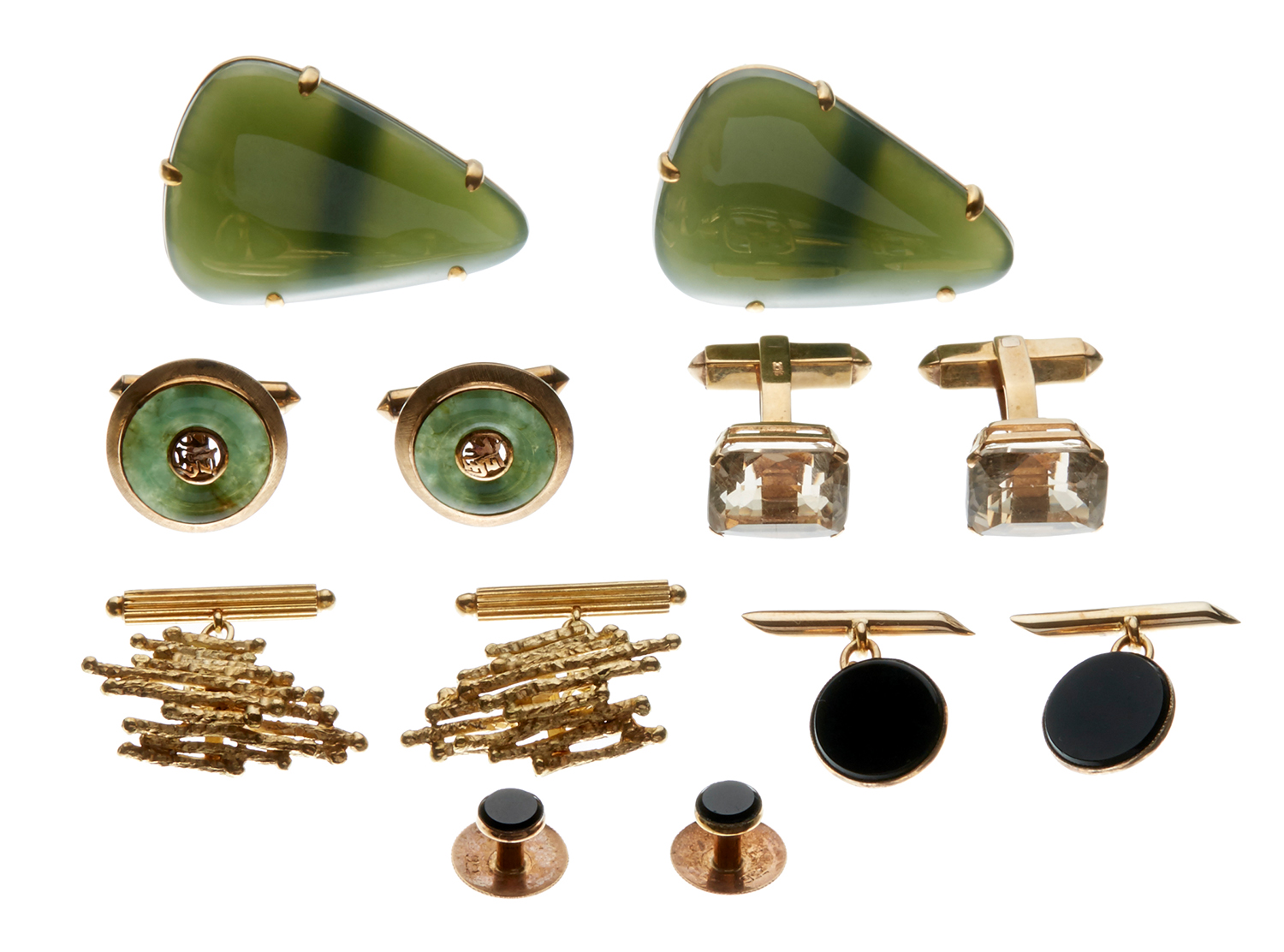 On pair set with turquoise mounted in 14ct white gold, with matching tie pin, together with three other pairs of cufflinks including, onyx and jadeite, iolite and green agate, all in 9ct gold. (4)