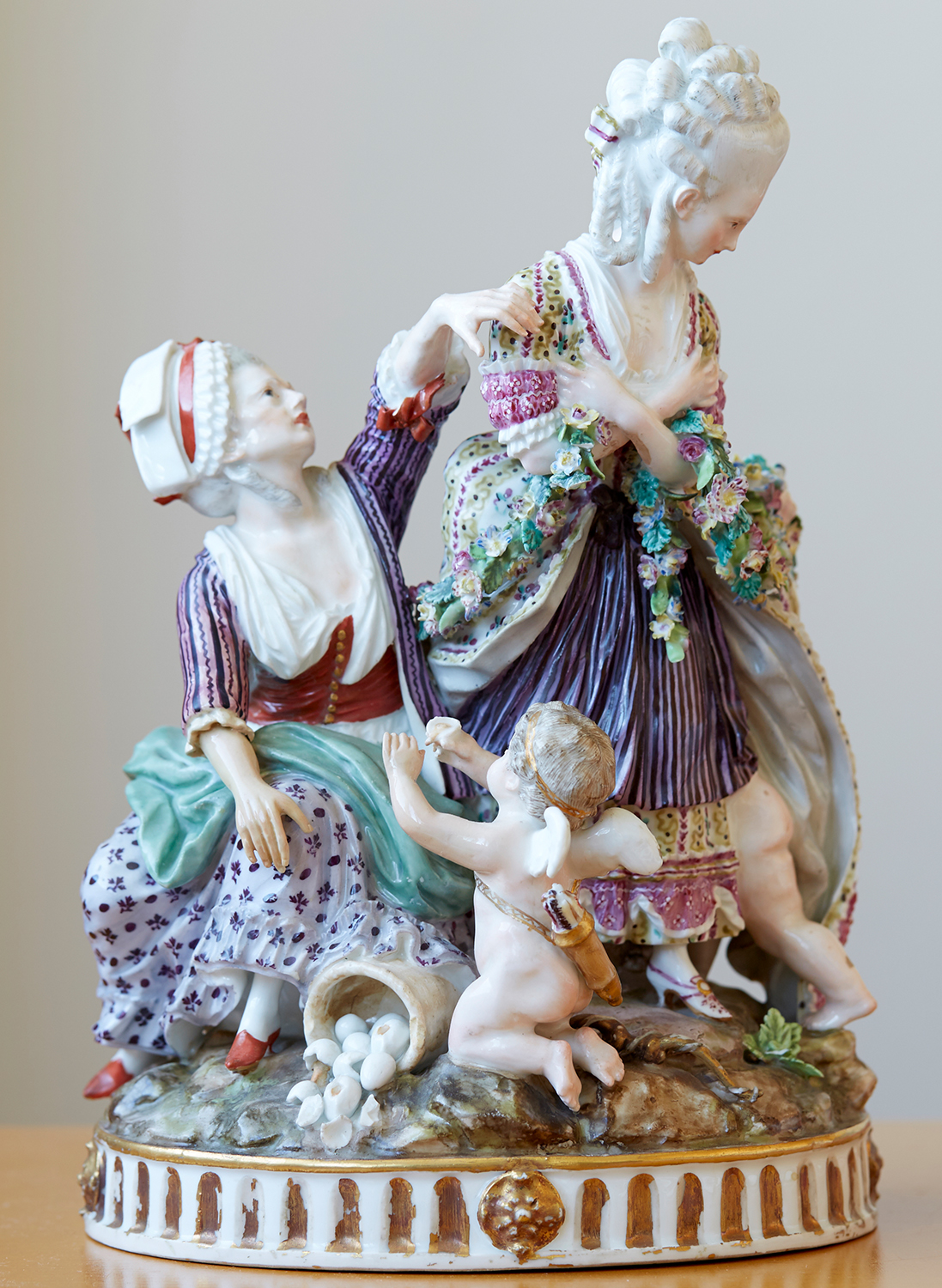 Typically modelled, polychrome and gilt painted, blue crossed sword mark to base, 24.5cm high