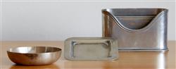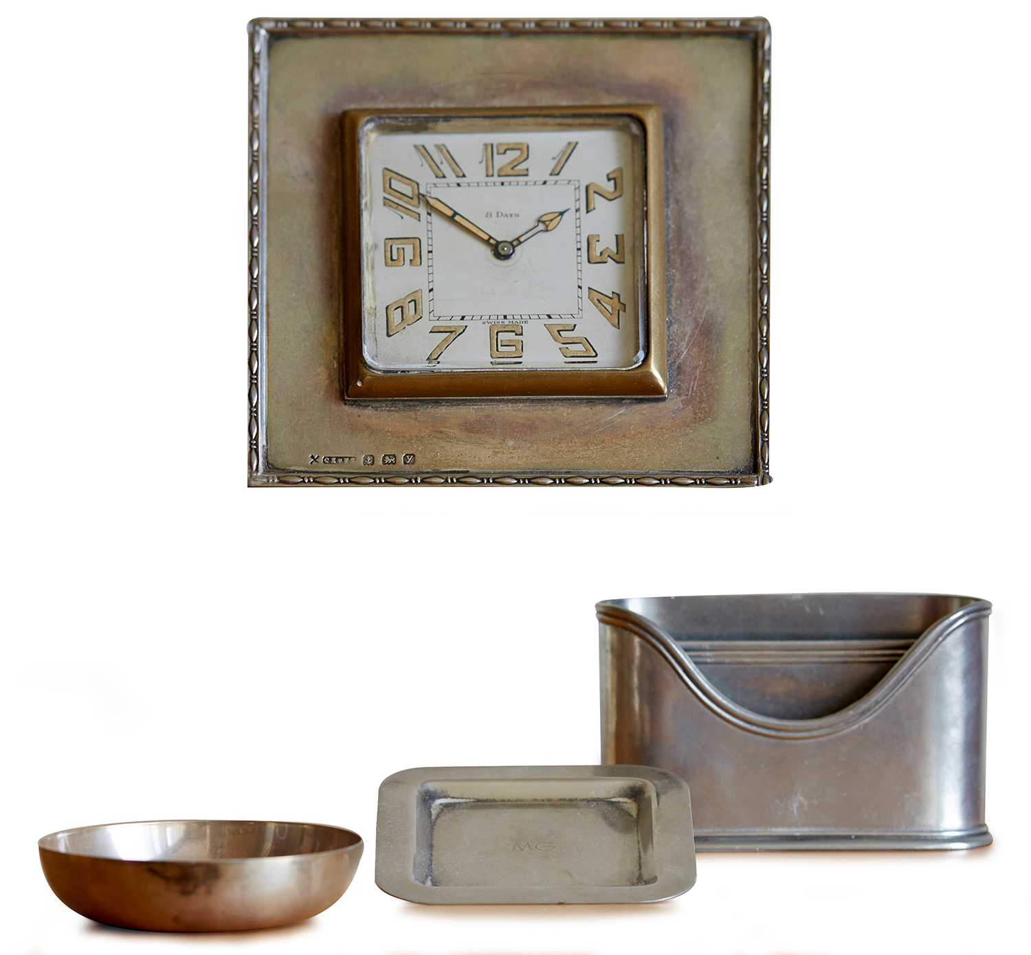 A BVLGARI 925 SILVER DISH, TOGETHER WITH RINO GREGIO OLRI SILVER DISH AND ITALIAN LETTER HOLDER MARKED 95 ART DECO STERLING SILVER CLOCK BY CORNELIUS SAUNDERS