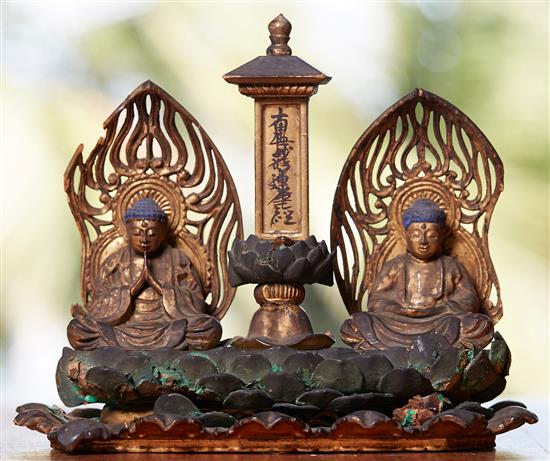 Two figures seated on lotus base with partitioning architrave with script, damages to base (A/F)