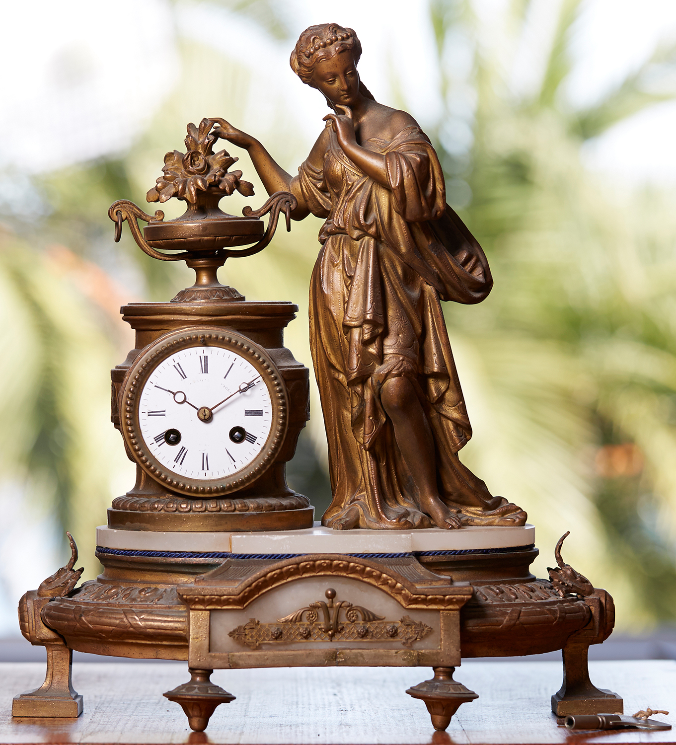 Not recently serviced or timed, restoration to front plate, graze to alabaster edge, visible in photos provided
