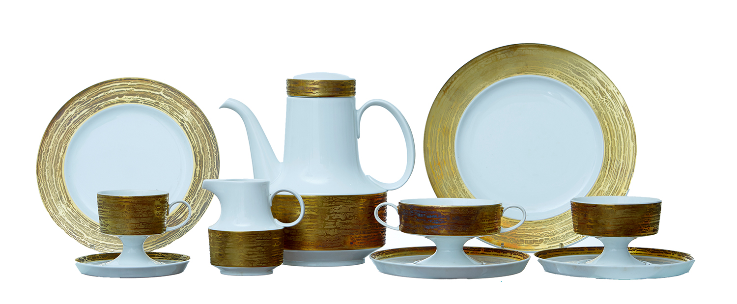 In arare tooled gilt, bark textured finish, comprising a full setting for seven
