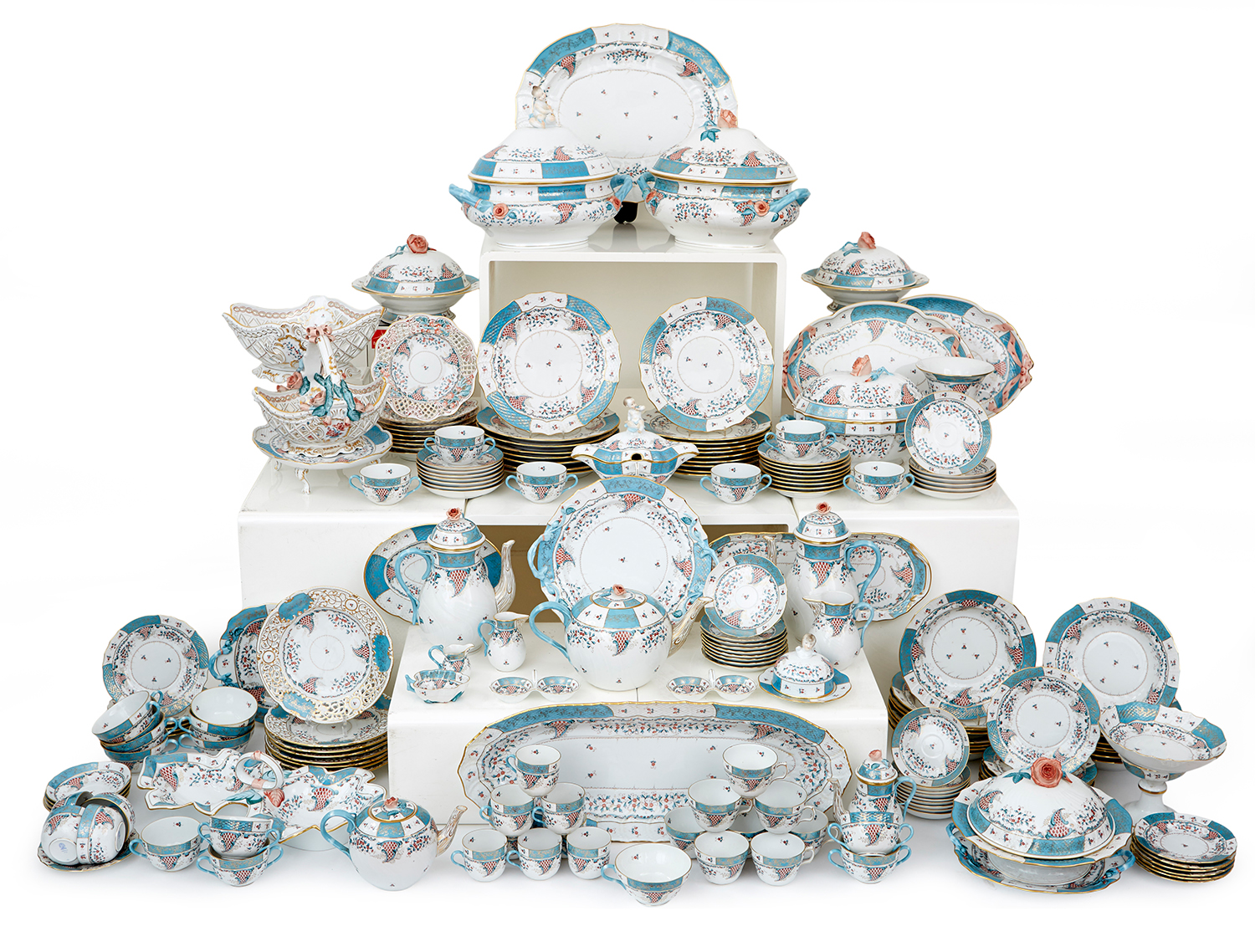 Notes; Borrowing just a handful of motifs from the Orient, the masters of Herend conjured this design inspired by the fairyland world of Arabian Knights this 'Cornucopia' replete also with cultural associations convey prodigal abundance. Perhaps why the service is a favourite with the Shah of Persia