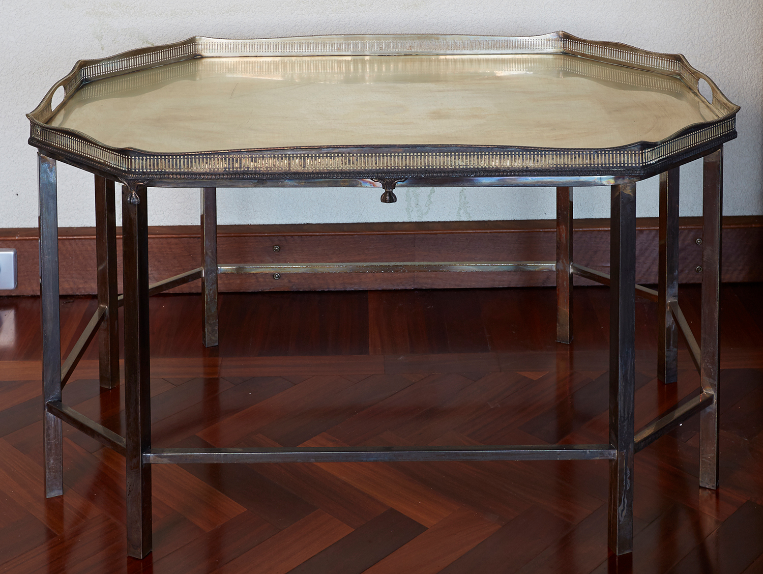 One claw foot missing, yellowing patina suggestive of base metal showing through