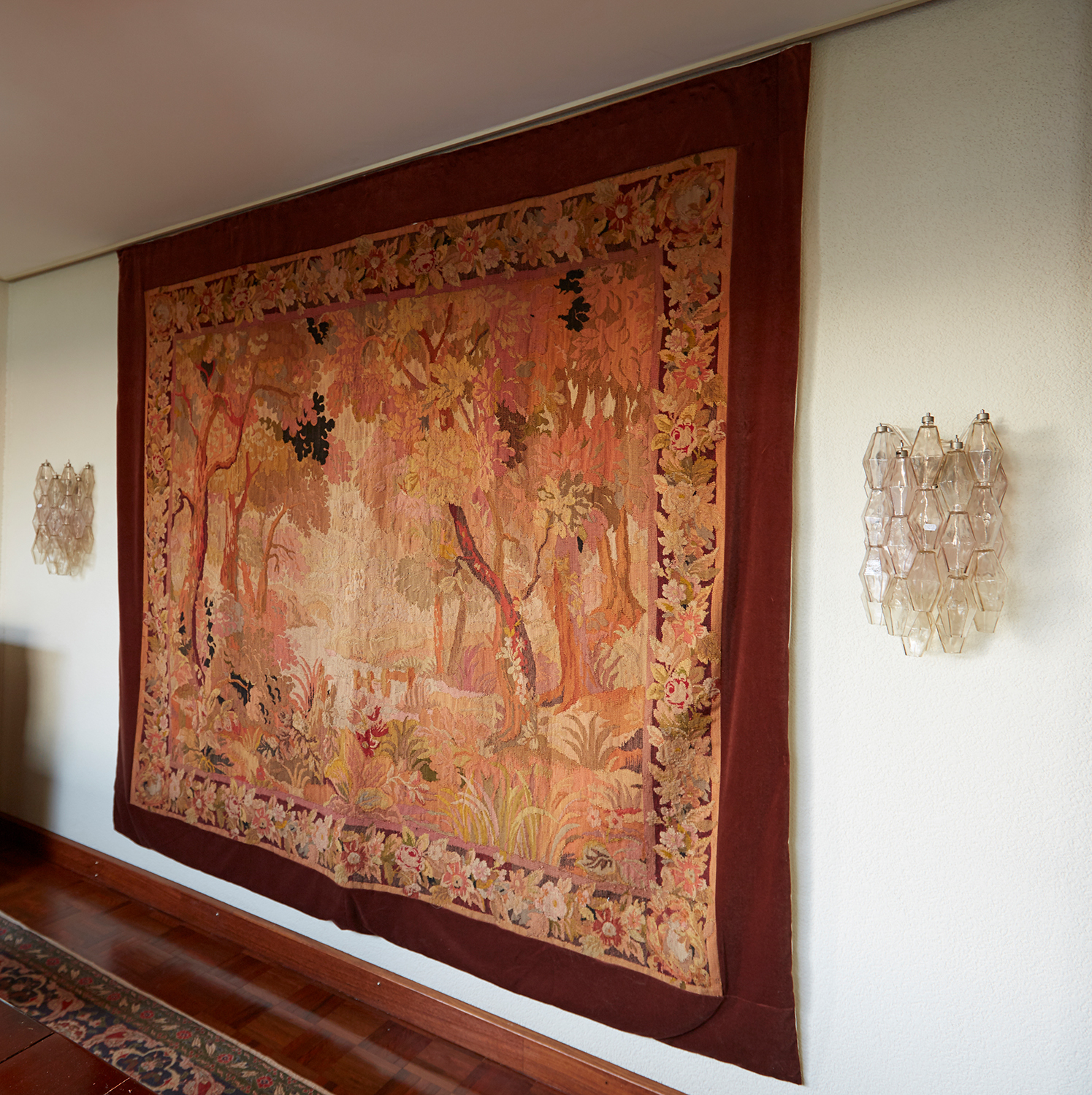 Depicting a pastoral scene within garland border mounted on velvet frame, 228 x 206cm