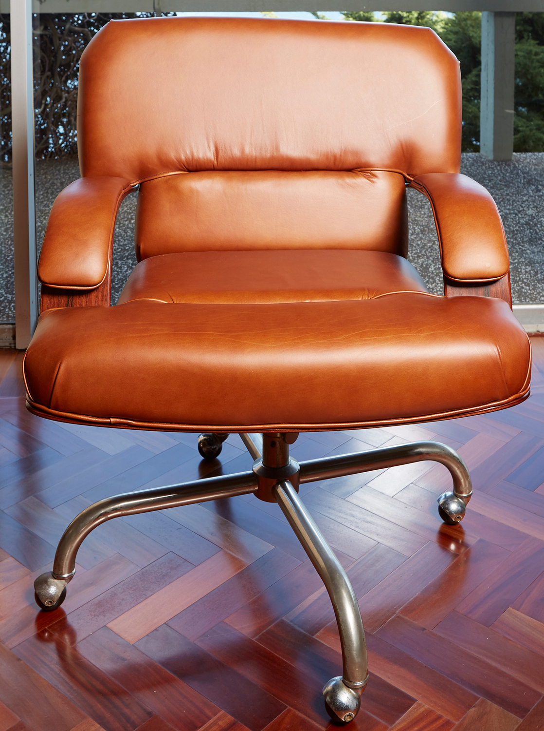 A ROSEWOOD AND LEATHER SWIVEL OFFICE CHAIR, CIRCA 1970'S