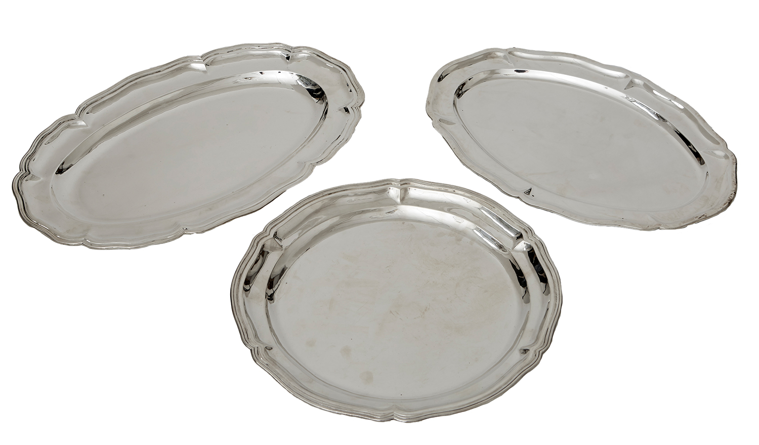 Each with reeded shaped rim, 52 and 47cm width and 42cm diameter, 3392 grams (3)