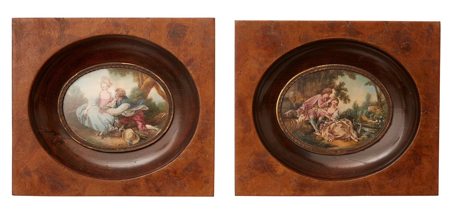 In inset oval burr walnut frames, frame 16 x 14cm