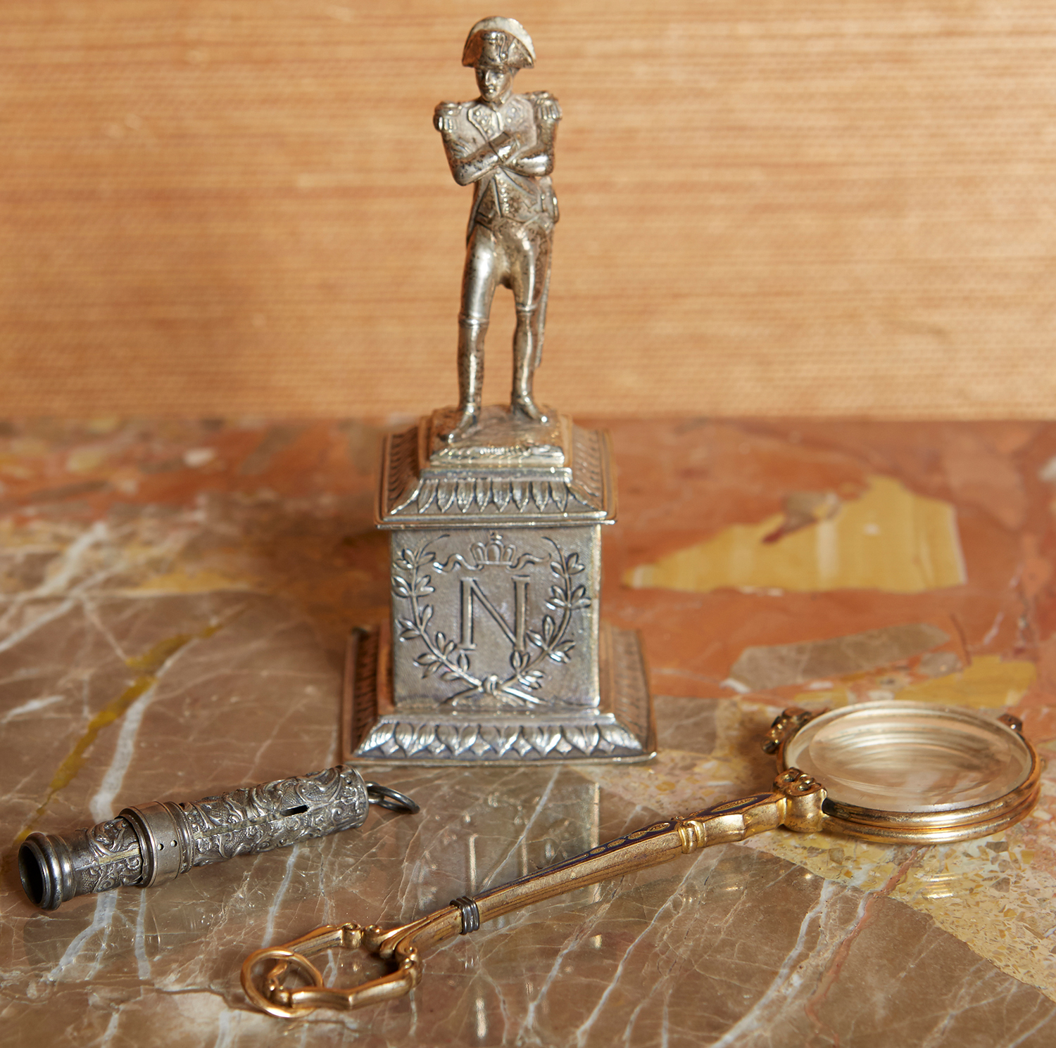 A STERLING SILVER FIGURE OF NAPOLEON, TOGETHER WITH A SILVER PENCIL HOLDER AND GILDED LORGNETTE