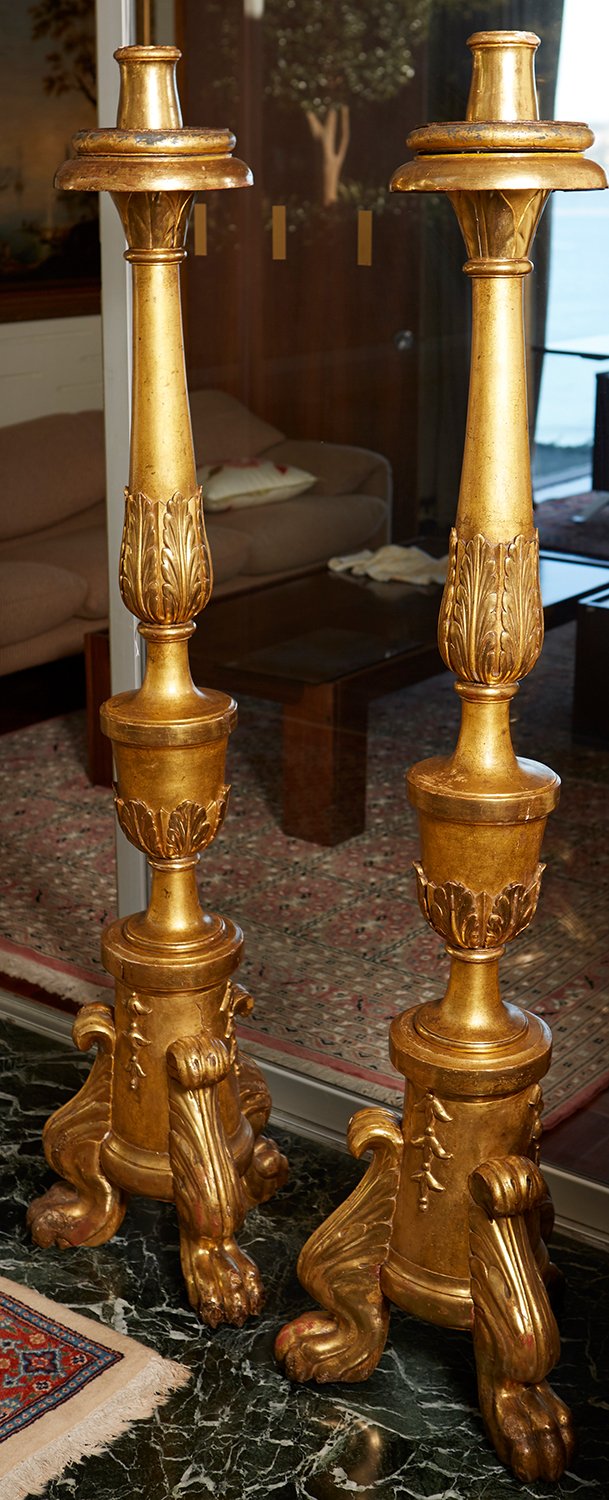 A PAIR OF ITALIAN 19TH CENTURY GILTWOOD GESSO TORCHERS