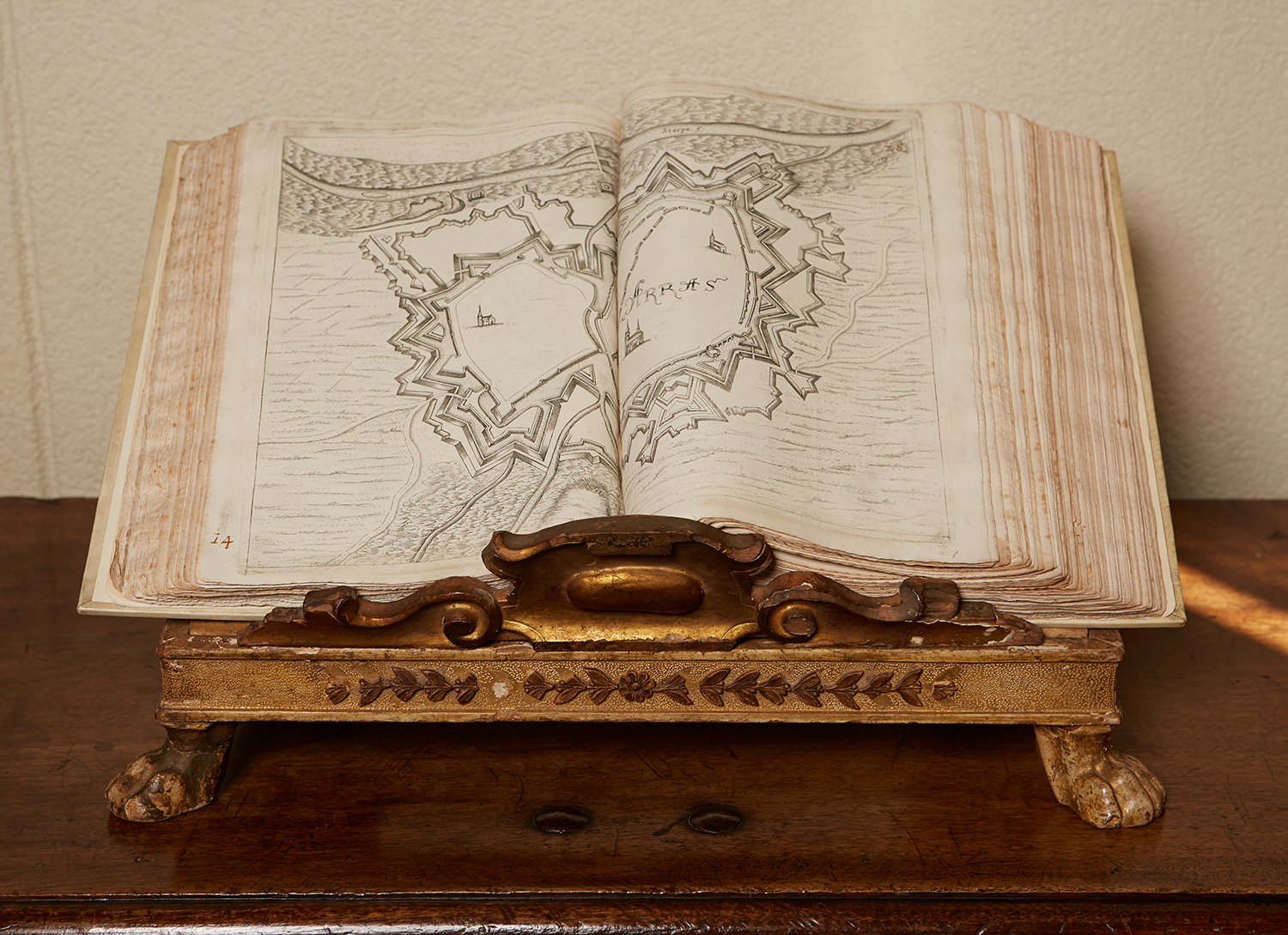 TEATRO DEL BELGIO FOLIO, CREATED BY GUALDO PRIORATO GALEAZZO 1606-1678, ON VENETIAN GILTWOOD BOOK STAND