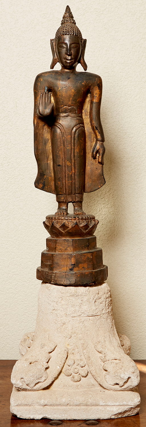 A LOATIAN CARVED GILTWOOD STANDING BUDDHA, 18TH CENTURY ON SANDSTONE CORINTHIAN CAPITAL STAND