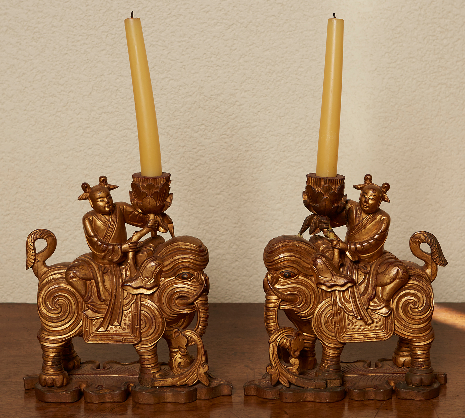 A PAIR OF CHINESE STRAITS GILTWOOD FIGURAL JOSS STICK HOLDERS, LATE 19TH CENTURY