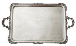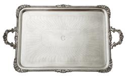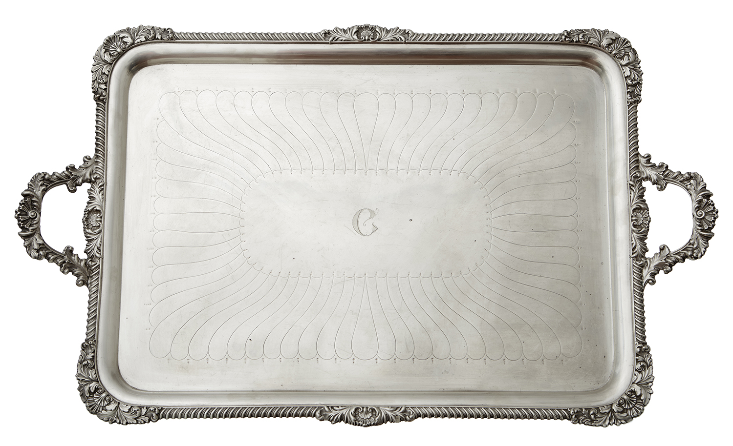 with gadrooned and anthemion and foliage scroll handles, central 'C' engraved initial, 72cm width, 3957 grams
