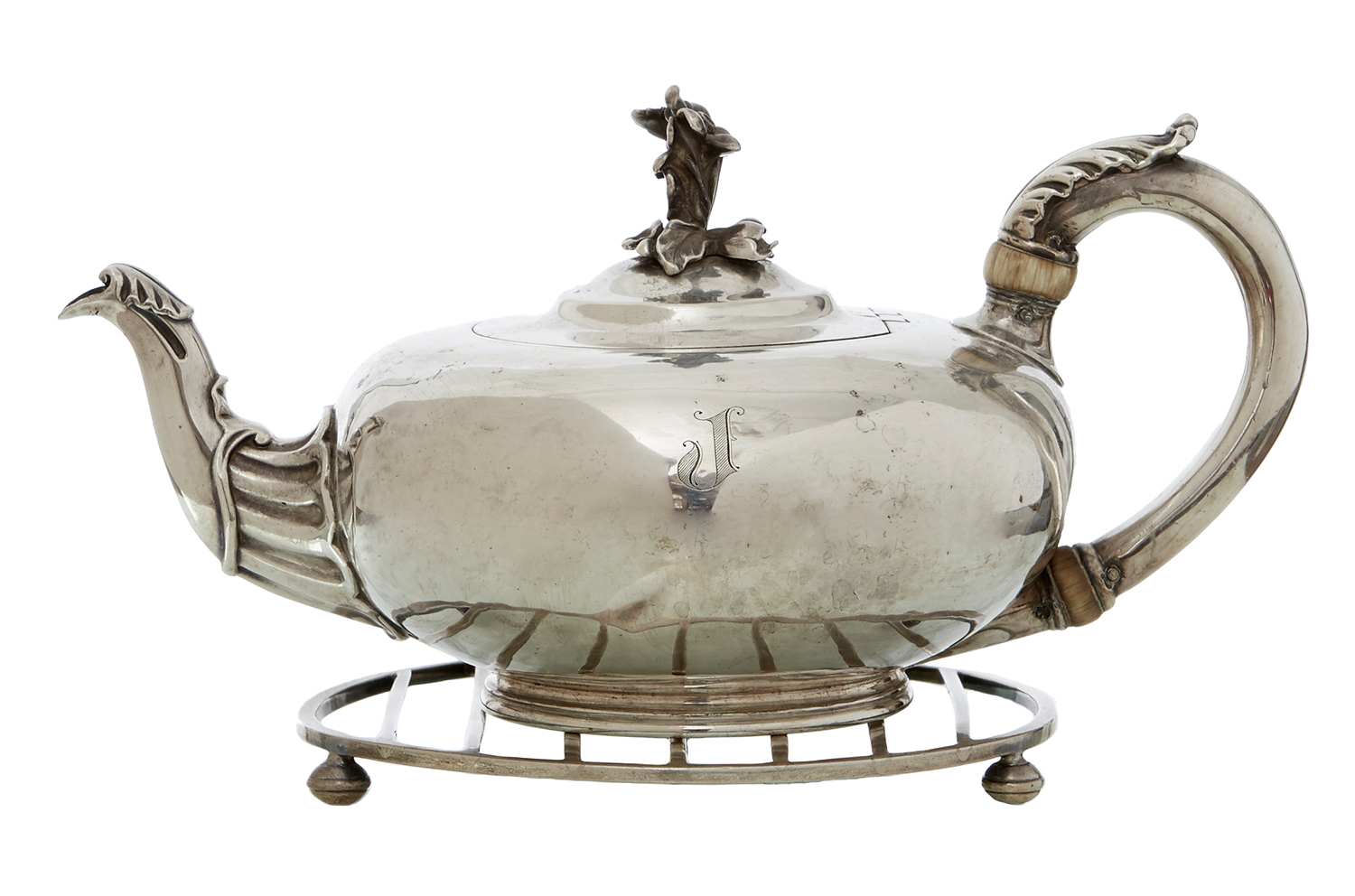 AN EARLY VICTORIAN STERLING SILVER TEAPOT, BY JOHN SAMUEL HUNT, LONDON 1851, WITH EARLY VICTORIAN STERLING SILVER STAND BY CHARLES THOMAS FOX & GEORGE FOX, LONDON 1847