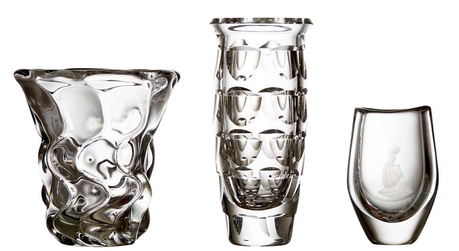 A DAUM CRYSTAL VASE TOGETHER WITH AN ELLIPTICAL CRYSTAL VASE AND ONE OTHER BY ORREFORS