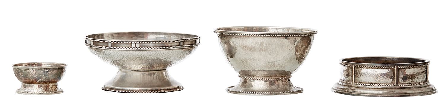The coaster of similar design marked KC with swan motif, the other larger bowl marked G.SILVER possibly with other stamps obscured. Each bowl of pedestal form with plenished finish and rope twist banded detailing with concentric coaster, 12, 11 and 10 and 6cm diameter, total weight 614 grams, (4)