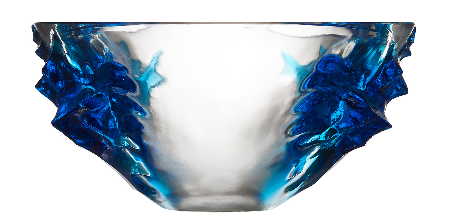 In thick clear glass with abstract frosted blue glass sides, 33cm width x 16cm high