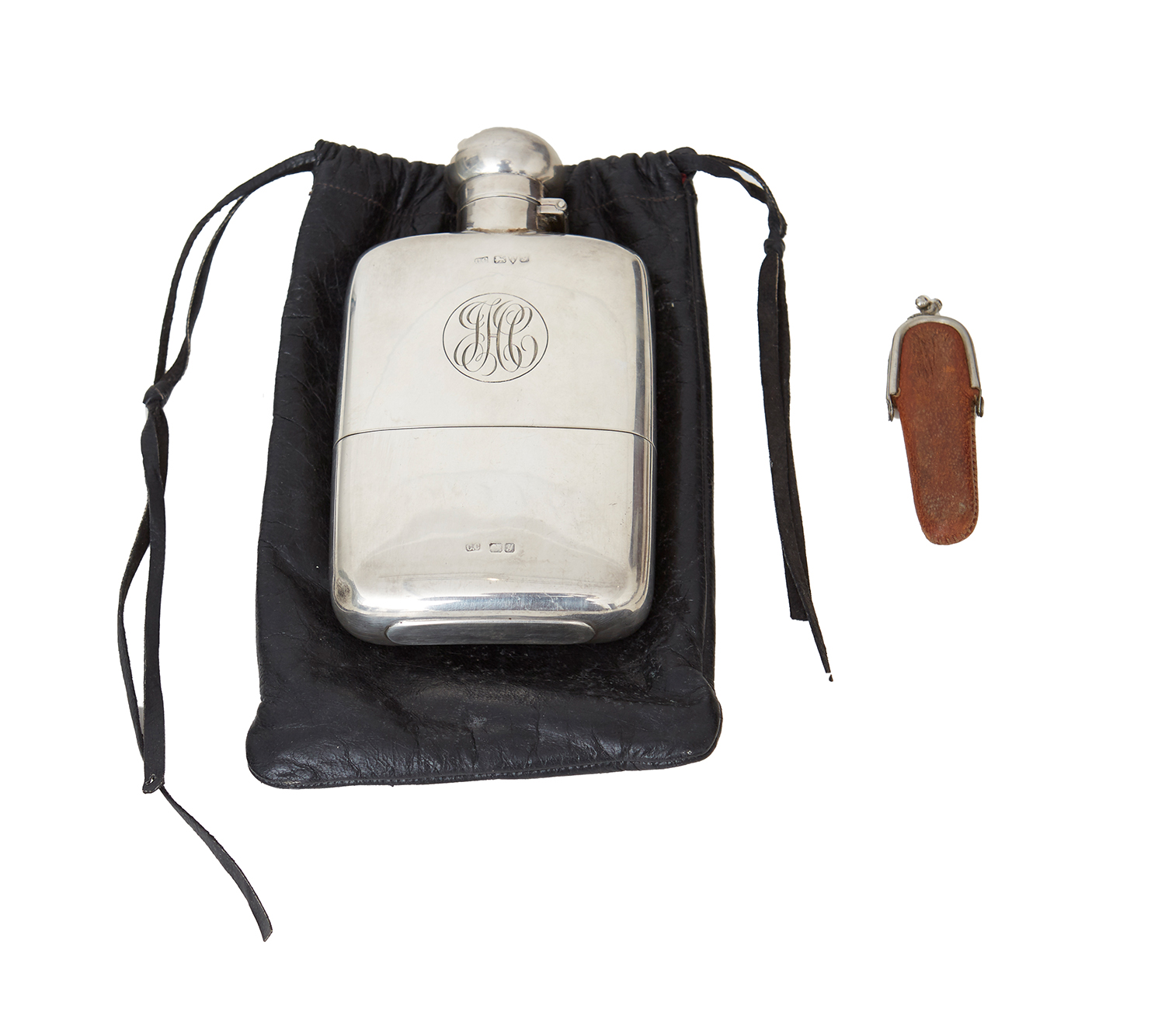 Engraved with initials, the knife with leather pouch, (2) 240 grams in total