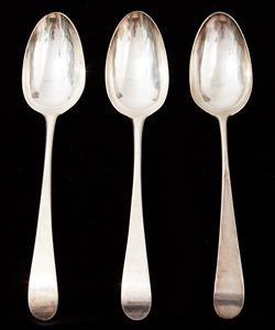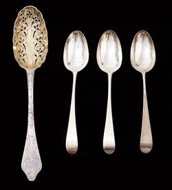 A PAIR OF GEORGE III STERLING SILVER SPOONS BY HESTER BATEMAN, LONDON 1784, WITH A GEORGE I SPOON AND A GEORGIAN BERRY SPOON