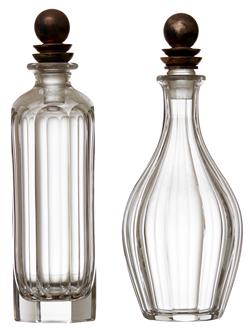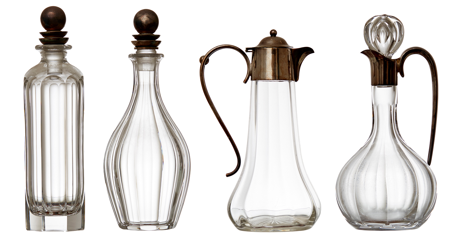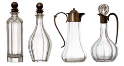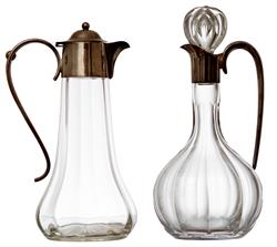 TWO BACCARAT DECANTERS WITH GEORG JENSEN STOPPERS, WITH A STERLING SILVER MOUNTED CLARET JUG AND SILVER PLATE MOUNTED WATER JUG