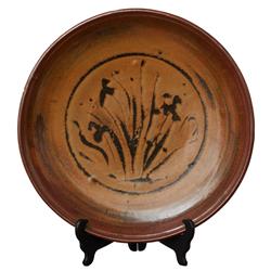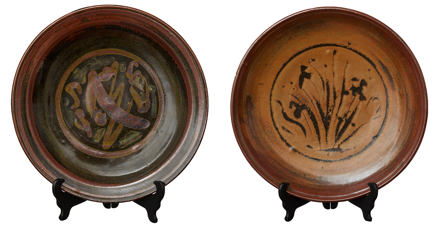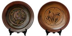 With wax resist abstract and grass motifs, seal and signed marks, 43 and 39cm diameter, (2)