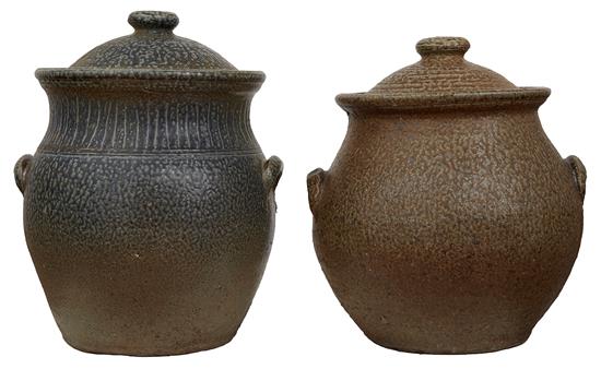 With speckled glaze, seal marks to covers, 46 and 43cm high, (2)
