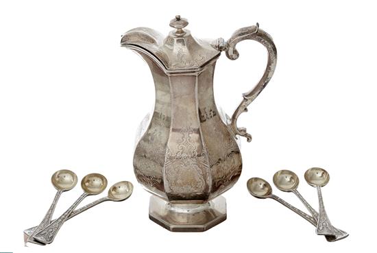 A SET OF SIX VICTORIAN STERLING SILVER GILT SALT SPOONS BY GEORGE WILLIAM ADAMS, LONDON 1861 WITH A SILVER JUG AND COVER BY JOHN ANGELL II AND GEORGE ANGELL, LONDON 1861