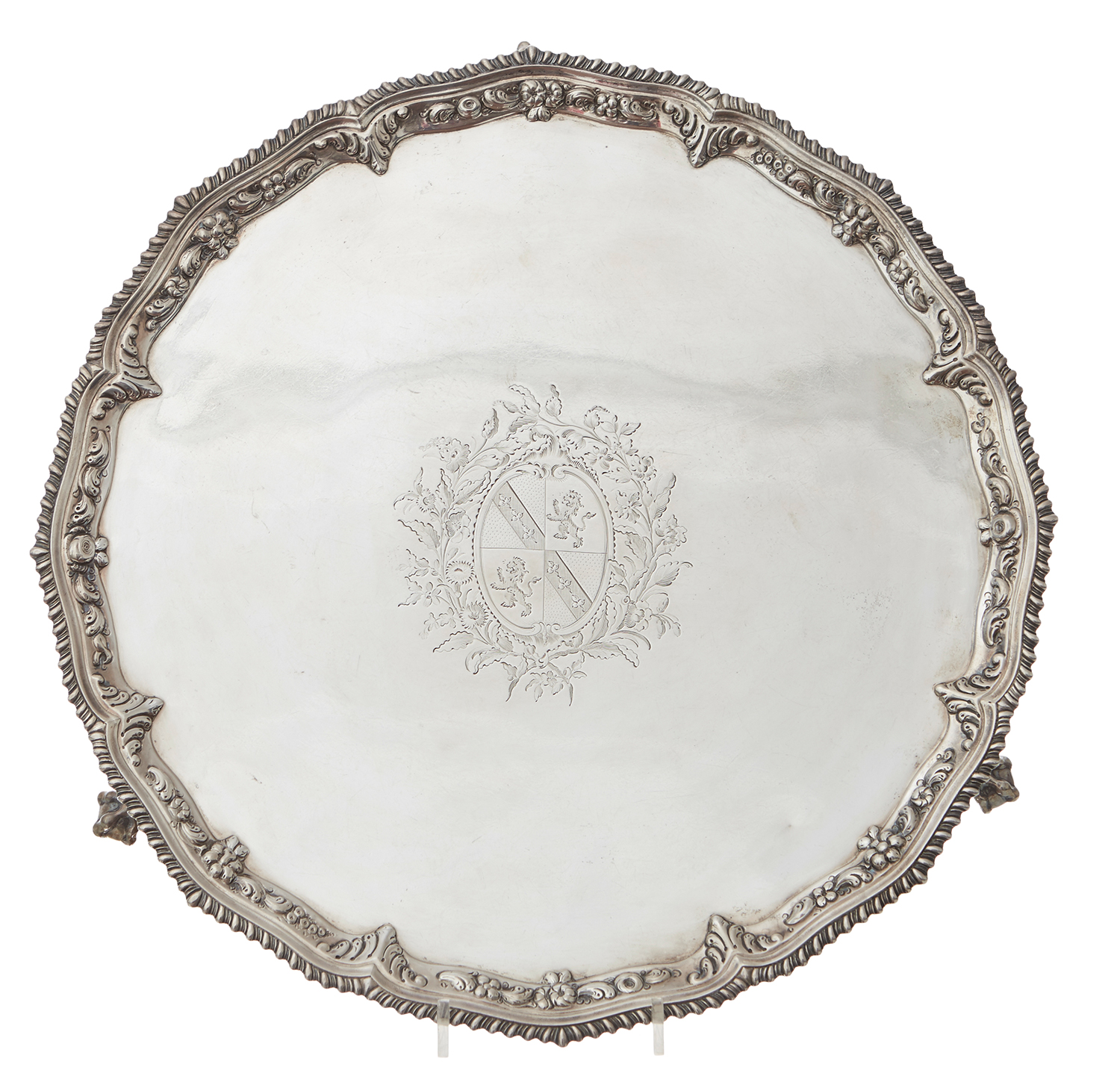 Of shaped circular form with gadrooned edge, centrally engraved with armorial, 36cm diameter 1320 grams
