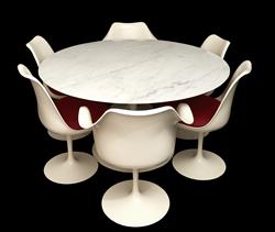 In November 1961, the first Saarinen 'Tulip' chairs and Pedestal table made their first Australian appearance, taken straight from the shipyards to the Art Gallery of NSW, where Best installed the setting in her '20th Century Room' at a public exhibition Leslie Walford had organised for the Art Gallery Society. Best placed Saarinen's dining setting at the centre of a minimalist space, almost contemplative in its backdrop of Japanese temple blinds, Tapio Wirrkala light sculpture and Carl Plate painting, yet luxurious with thick pile carpet and light bouncing off the Chinese red glazed ceiling. The exhibition sparked a rage for the Saarinen furniture and it soon appeared in all Best's finest interiors, including Lady (Mary) Fairfax's white on white beach pad at Bondi.