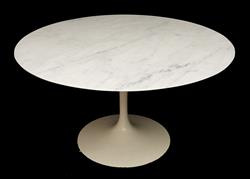 Constructed with a circular marble top raised on an enamelled cast aluminium base, labelled Knoll to underside, including bespoke made wooden extension allowing seating for twelve, 137 wide x 72cm height