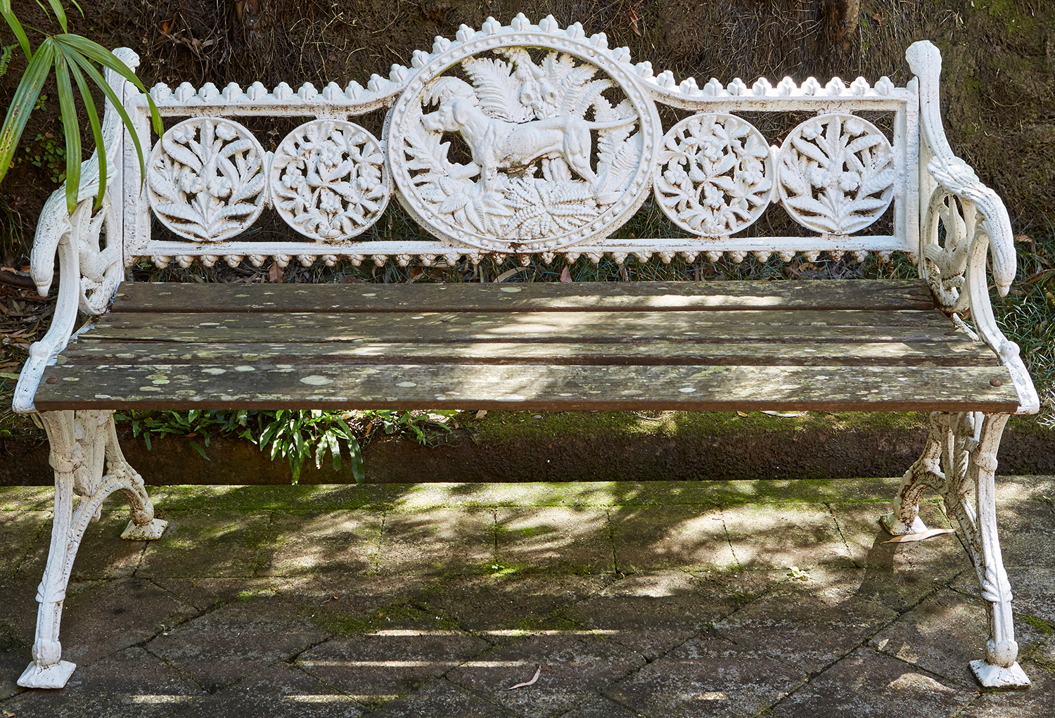 With a cast panel to back depicting a hunting dog, the arms with birds