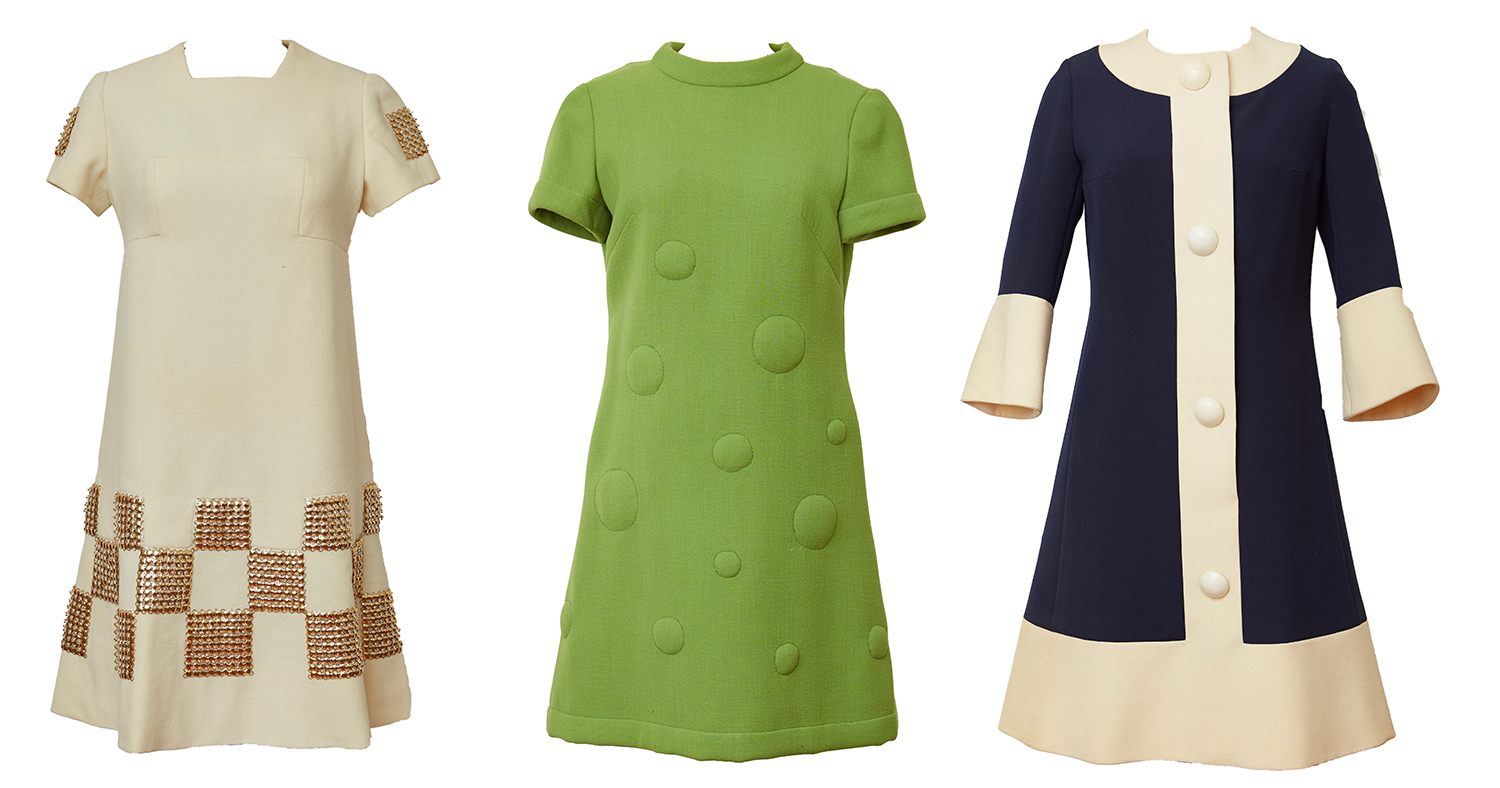 Comprising; one navy & cream coat dress, a green short sleeve shift dress with padded and top-stitched geometric design [original accompanying sketch from Carven Paris], and a cream wool shift dress with metallic embellishment in geometric patterns to hem and sleeves [original acocmpanying sketch from Carven Paris], the first & third labelled 'Carven, 6. Rond Pont des Champs-Elysees, paris, MADE IN FRANCE", the second labelled "Mademoiselle carven paris, MADE IN FRANCE"