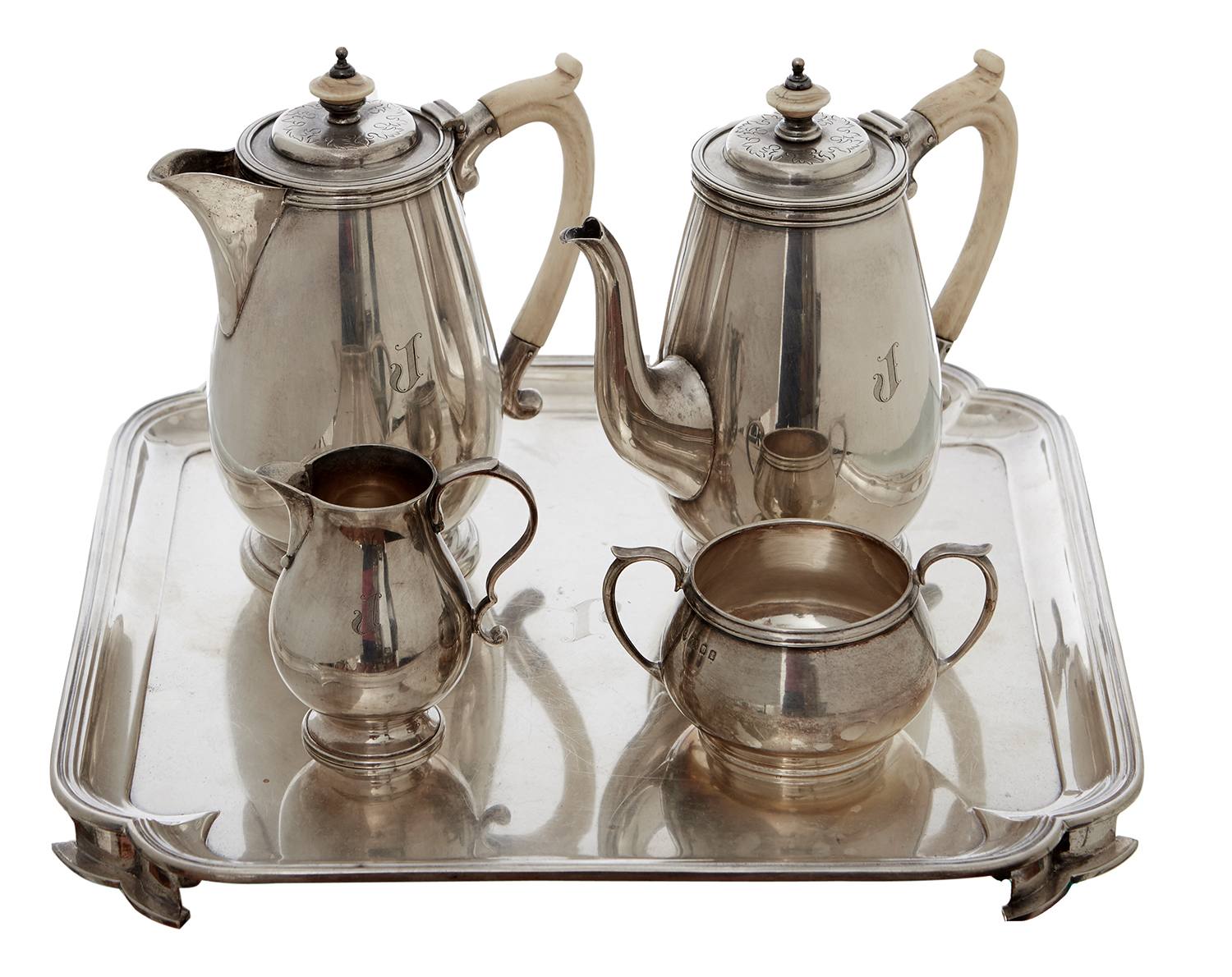 With ivory handles the two pots and sugar bowl by Edward Barnard & Sons, the tray of a later date and the jug matched both by Hardy Brothers, 2124 grams in total, (4)