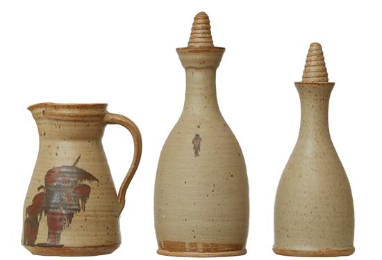 TWO AUSTRALIAN STONEWARE POTTERY DECANTERS AND JUG SET BY HAROLD HUGHAN (1893-1987)