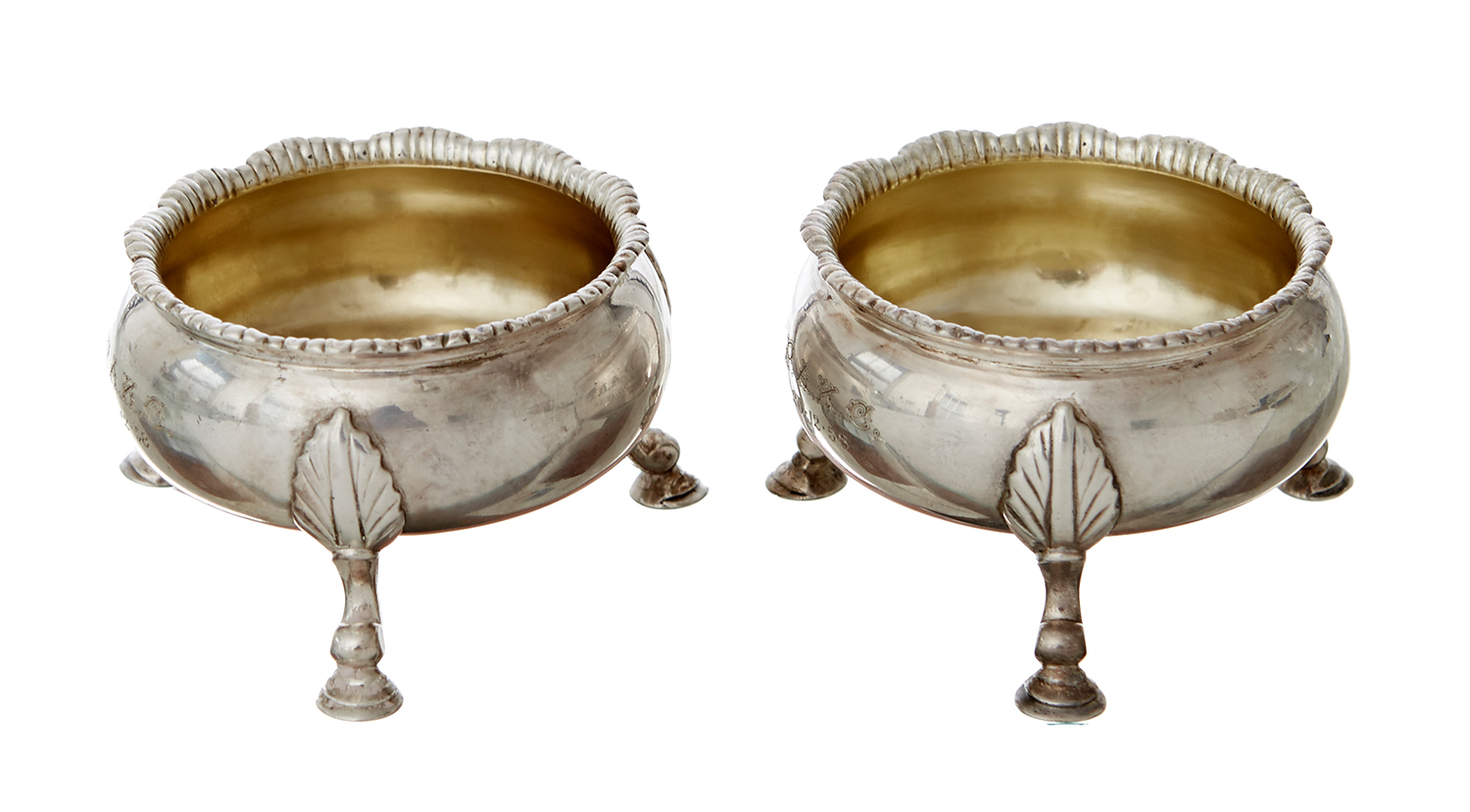 Each with gilded interior, gadrooned rim on stepped pad feet, engraved with bear claw armorial and initials verso, approximately 178 grams silver (2)