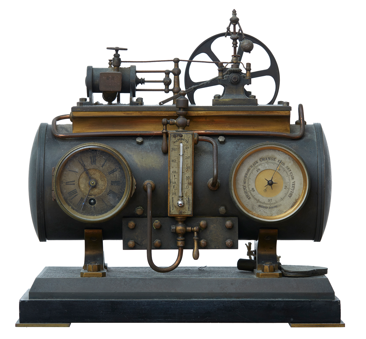 An industrial revolution 'steam engine' clock, French, 8-day, time only movement with barometer and thermometer dials, raised from bronze plinth, 26cm width