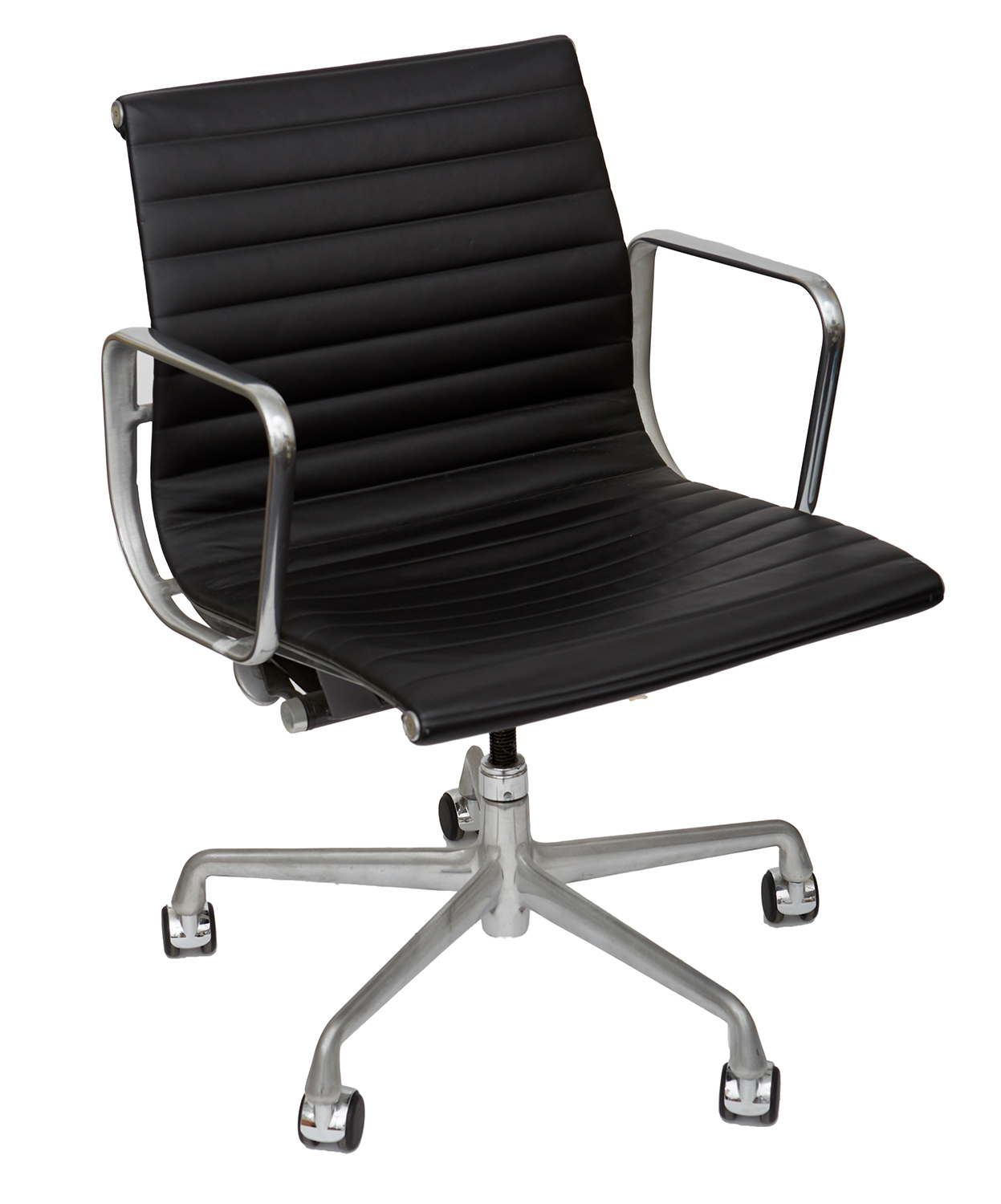In good order, with minor abrasion to aluminium at arms, general age related wear to legs and wheels from use, leather in very good order