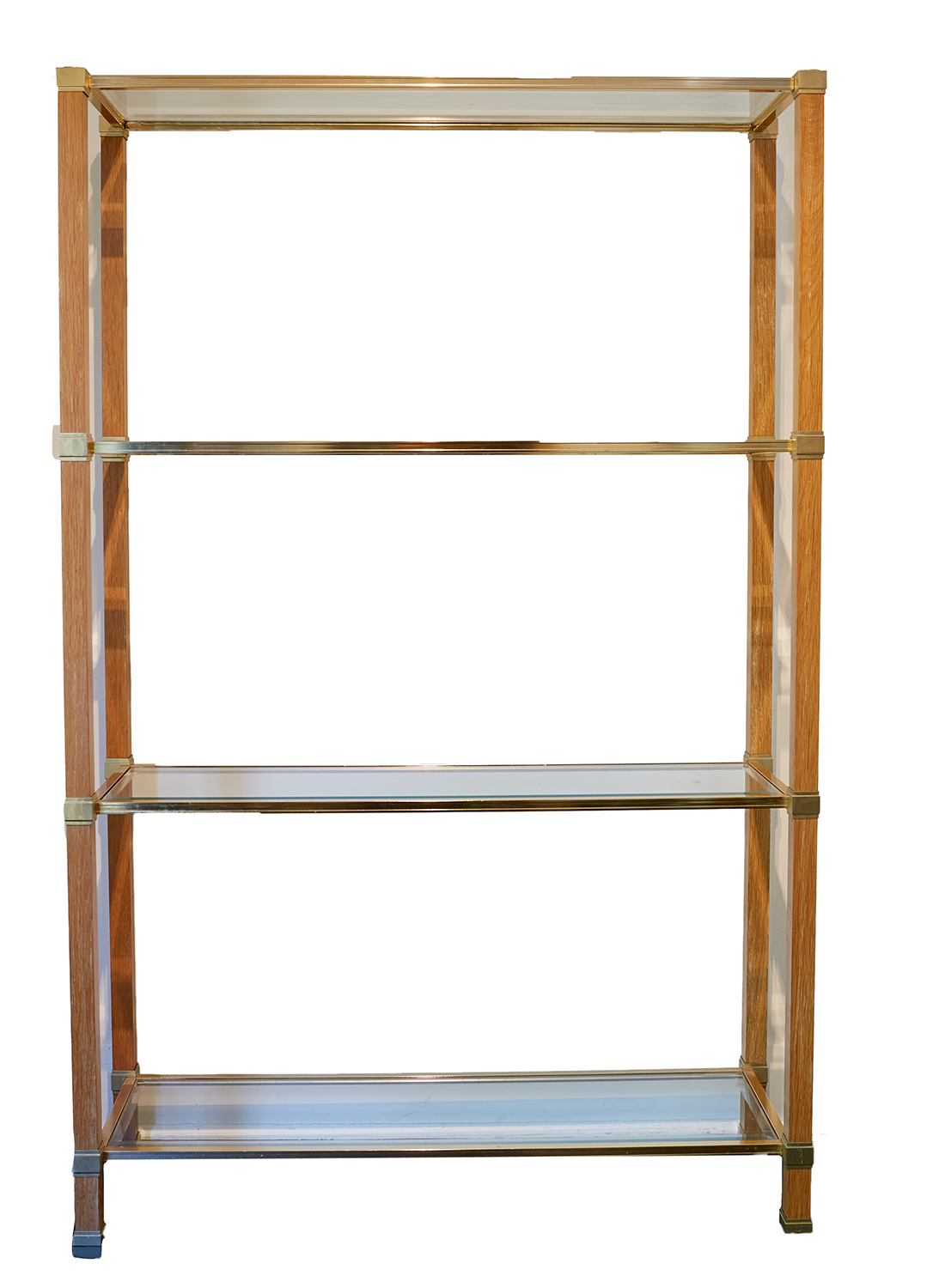 A BRASS AND BLONDE-WOOD ETAGERE WITH BEVELLED GLASS SHELVES, IN THE MANNER OF LA MAISON CHARLES