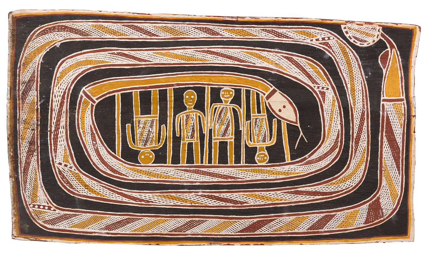 The natural earth pigments are quite thickly applied on the bark and some paint loss has occurred over time, most noticeably along the lower edge of the bark. Some of the white pigment has smudged in certain areas too.