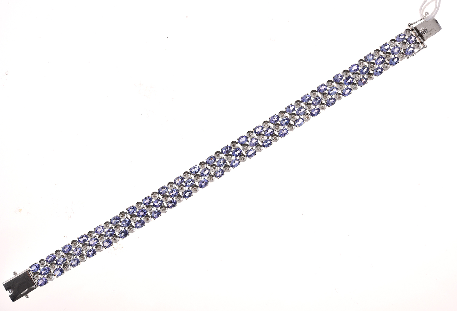 Styled in a chevron design, set with tanzanites totalling 10.50cts and round brilliant cut diamonds totaling 0.83cts, in 18ct white gold, total length 180mm.