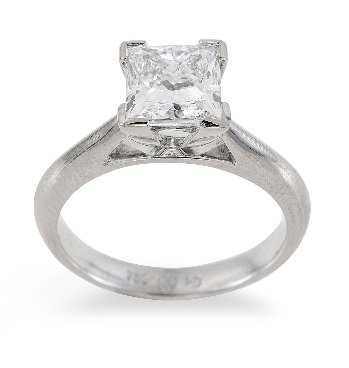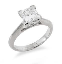 The princess cut diamond of 1.60cts, mounted in platinum and 18ct white gold, ring size K, having a GIA laser inscription to the girdle no 2111990302, stating colour E and clarity SI1.