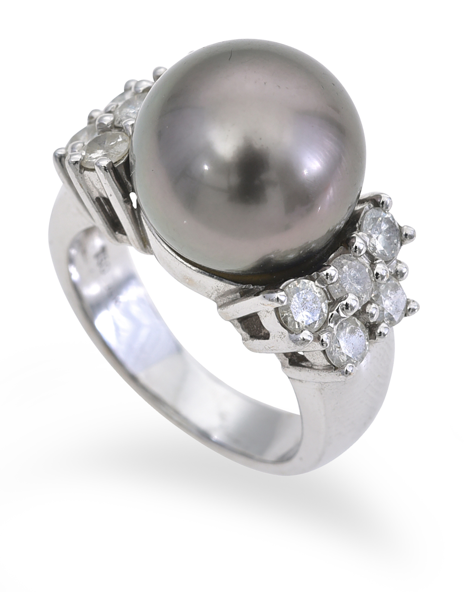The round pearl of grey and purple hues measuring 11.40mm, having five round brilliant cut diamonds set to each shoulder, mounted in 18ct white gold, ring size I.