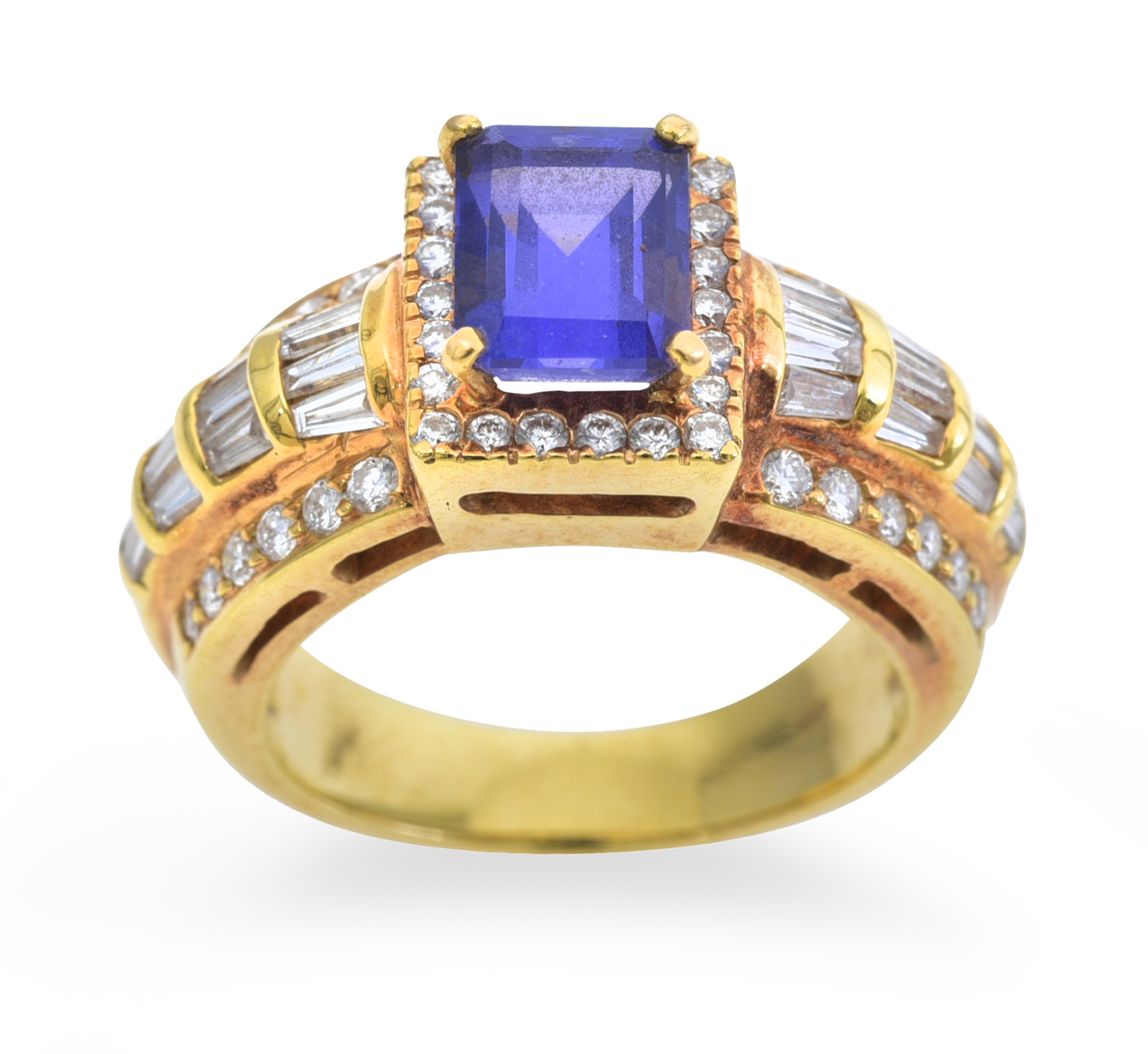 A TANZANITE AND DIAMOND RING - Comprising a rectangular tanzanite of 1.60cts, surrounded and shouldered by baguette and round brilliant cut diamonds totalling 0.80cts, mounted in 18ct gold, ring size I