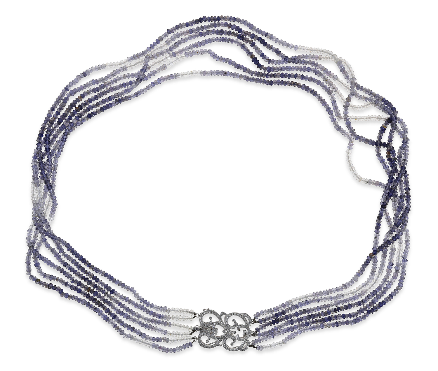 Comprising six strands of variegated tanzanite, to a fancy diamond set clasp in 14ct white gold, total length 560mm.