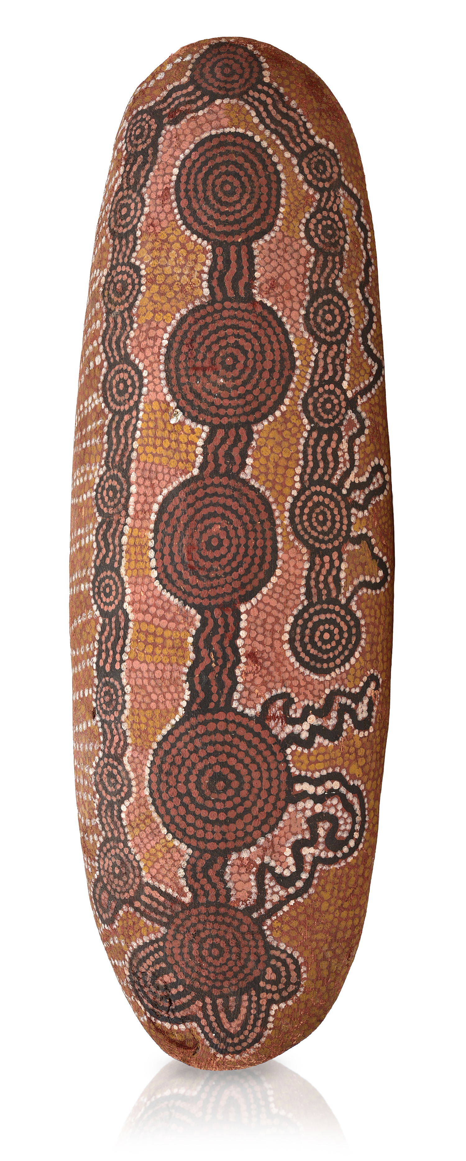 decorated with ceremonial designs on both sides with natural earth pigments on carved wood