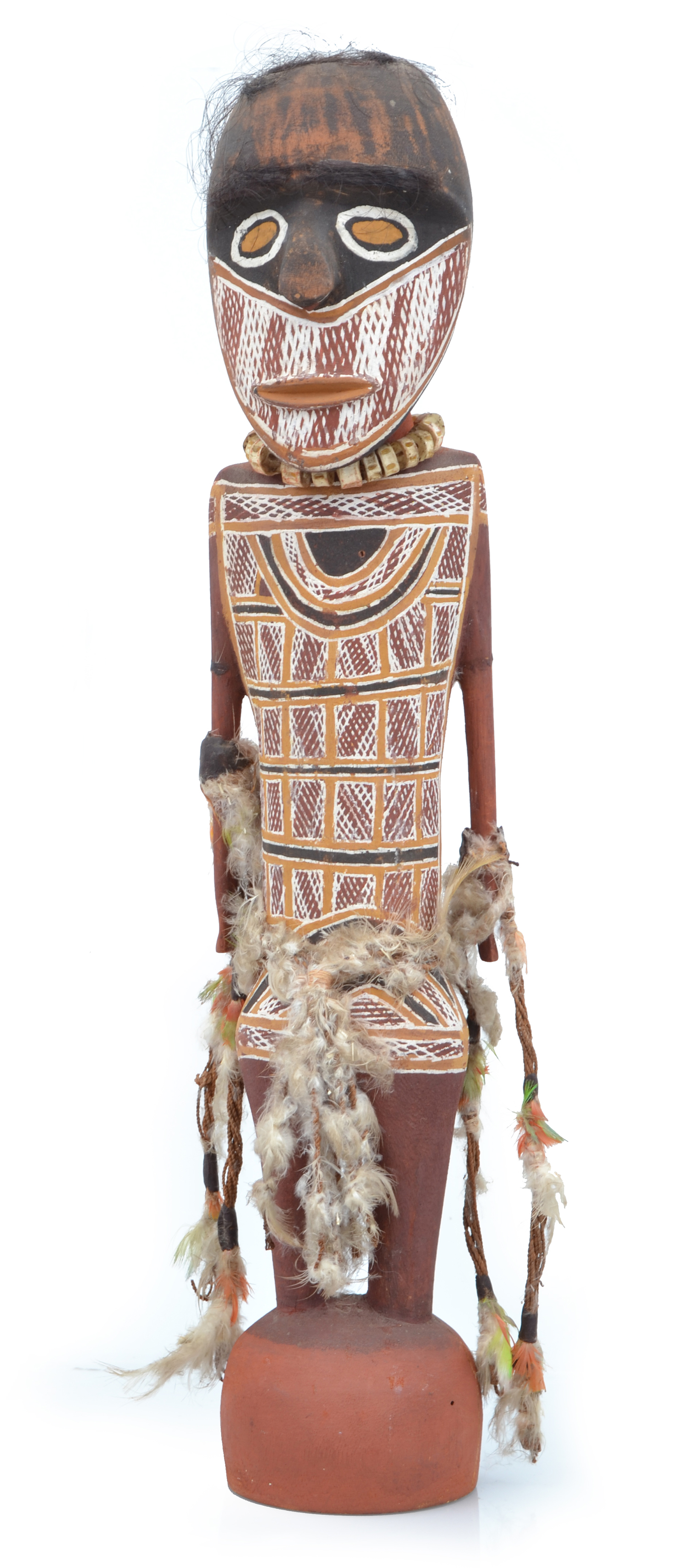 natural earth pigments on carved wood, bush string, bone, human hair, feathers and gum